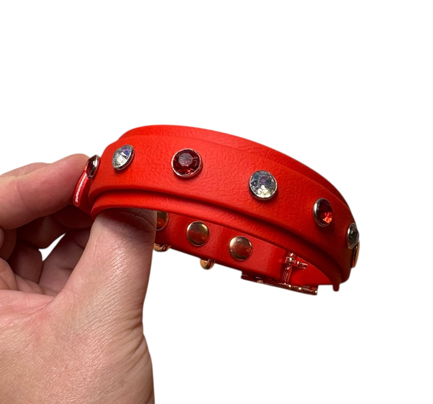 Crafted from red premium coated waterproof webbing and adorned with iridescent and red rhinestone crystals, this double layered collar sparkles in the sunlight and glows with personality. Paired with eye-catching rose gold hardware, it’s a bold and beautiful statement piece.