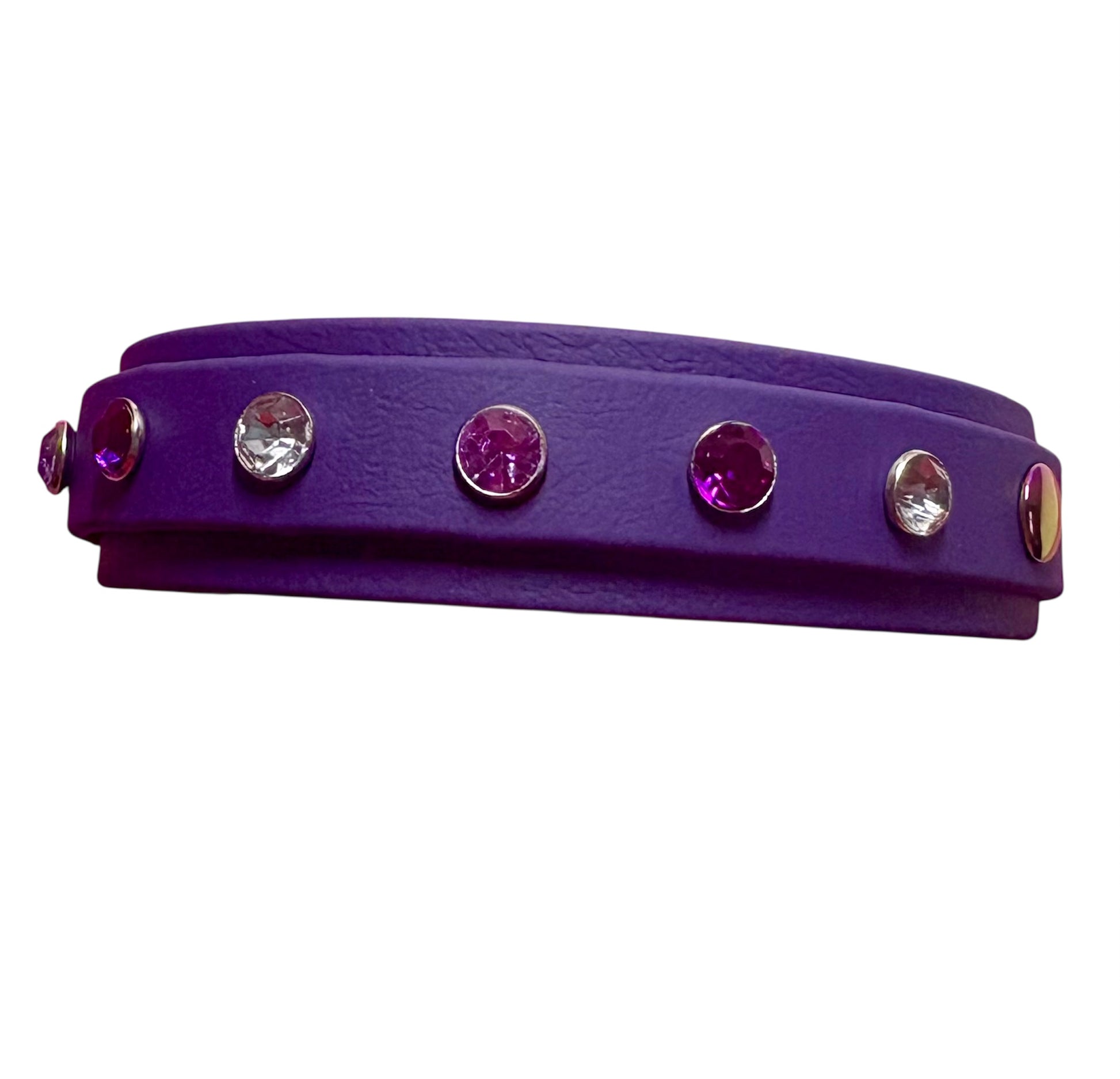 Crafted from premium violet Biothane and adorned with iridescent, lilac and violet rhinestone crystals, this double layered collar sparkles in the sunlight and glows with personality. Paired with eye-catching rainbow hardware, it’s a bold and beautiful statement piece.